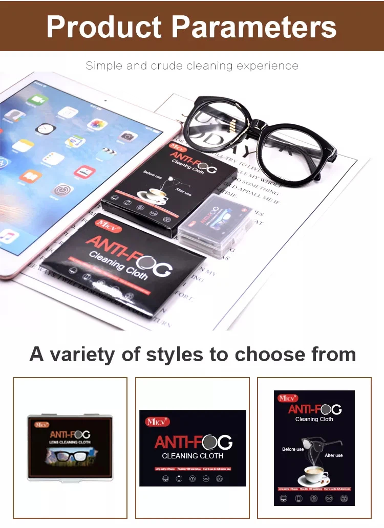 Anti Fog Spectacles Cloth uses a high-tech defogging formula that effectively prevents vapor condensation on the lens surface and forms a highly effective anti-fog layer on the surface that dries quickly without leaving streaks or residue.